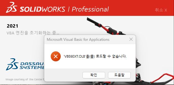 솔리드 웍스 사용할 때 마다 VBE6EXT.OLB를 로드할 수 없습니다.
