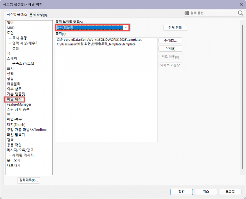 솔리드웍스에서 기본으로 제공되는 문서 템플릿에 대한 경로는 다음과 같습니다.