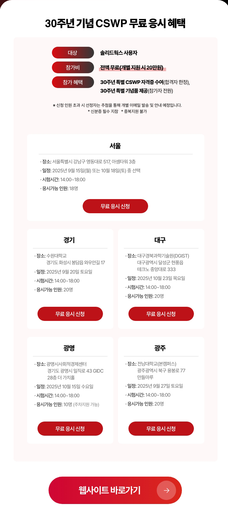 따로 자격증반 교육은 없으나, 응시 확정 시 CSWP 기출문제를 메일로 보내드립니다~